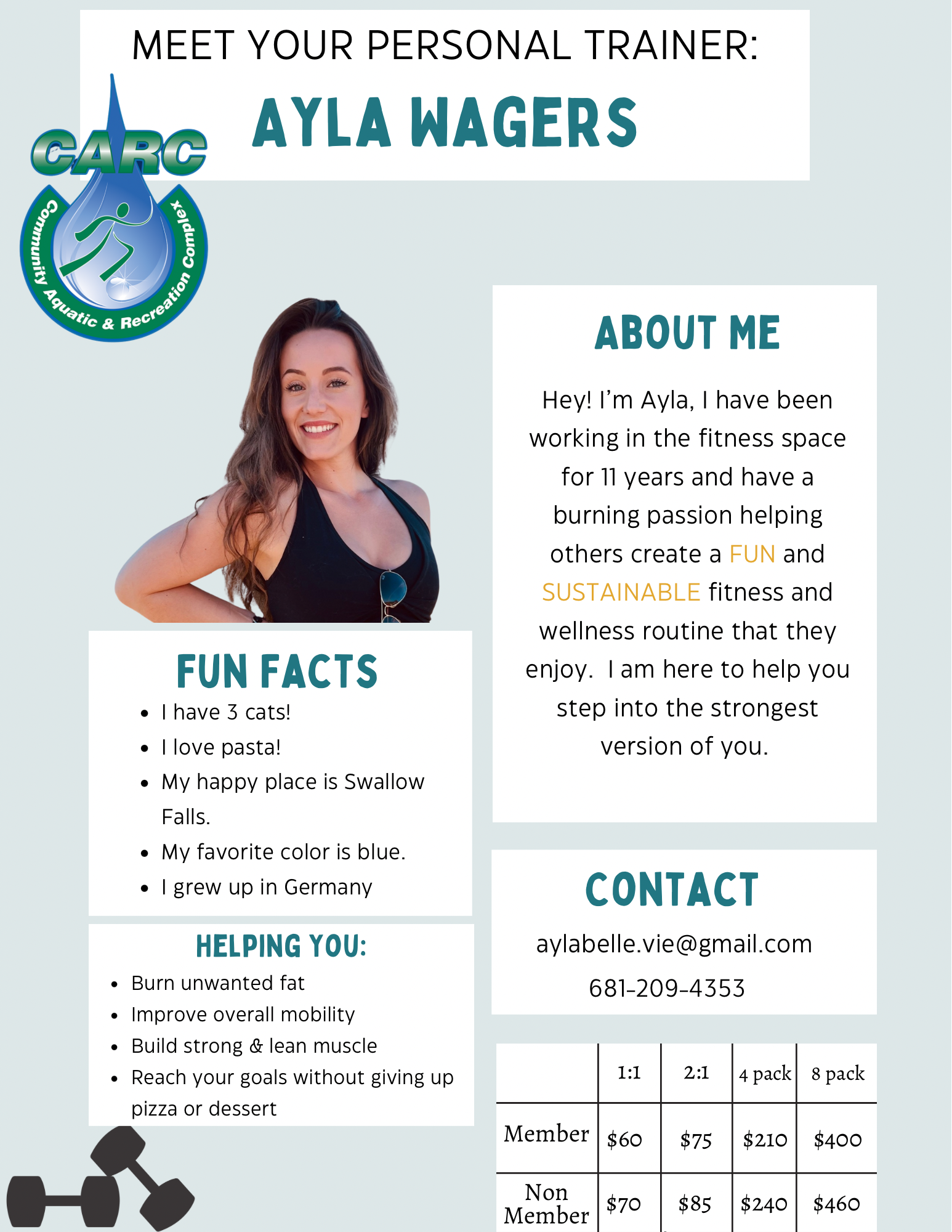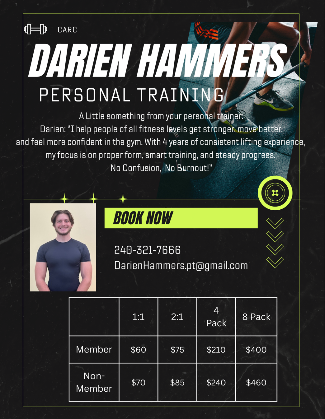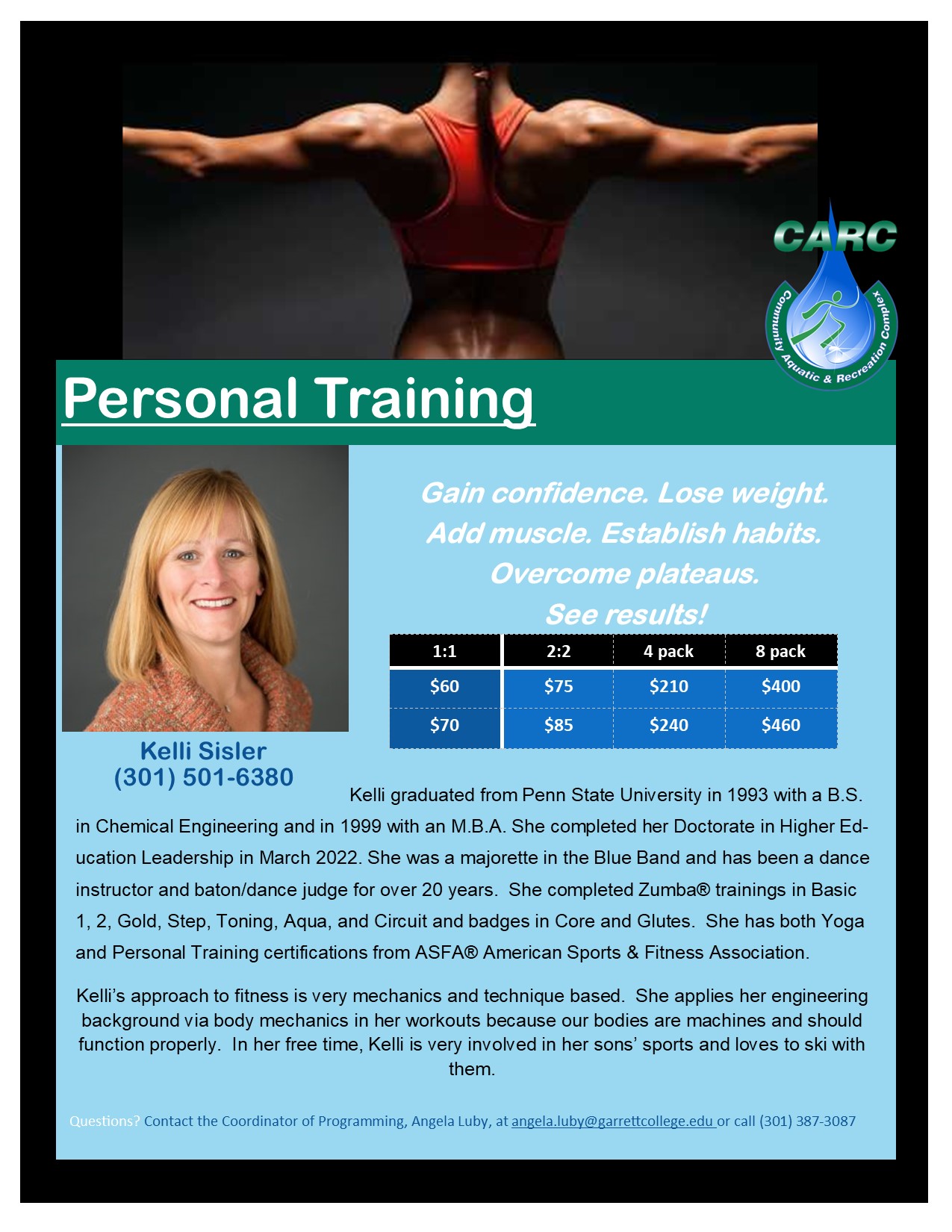 Meet our trainers by reviewing the personal trainer bios that are posted at the CARC or below. Feel free to contact a potential trainer if you have questions.